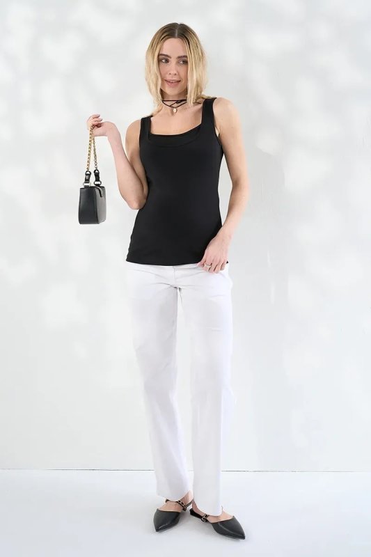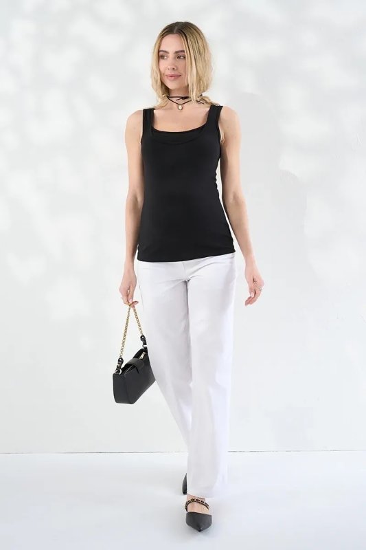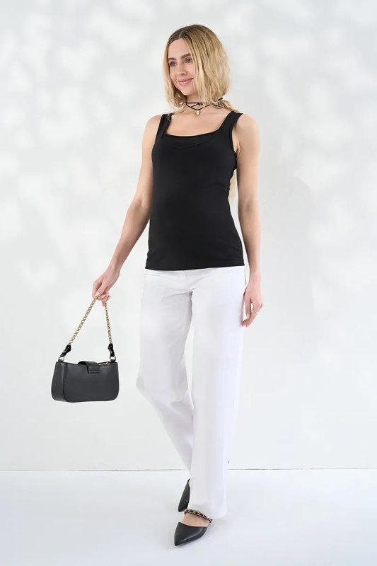Матеріал Стрейч-котон — щільна, але еластична тканина з невеликим відсотком розтяжності (3–4%). Приємна до тіла, дихає, не подразнює шкіру і добре тримає силует. Білий колір виглядає свіжо і легко поєднується з будь-якими топами, блузами та жакетами.
