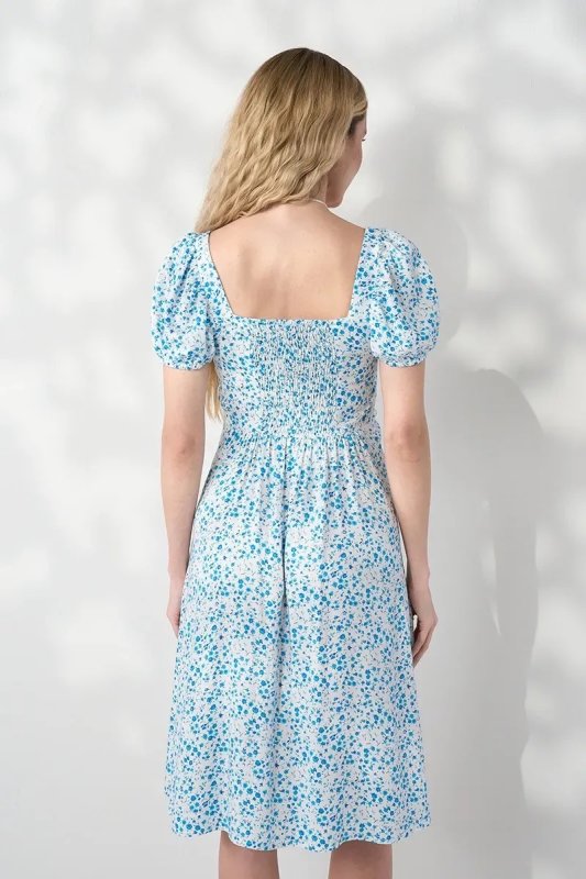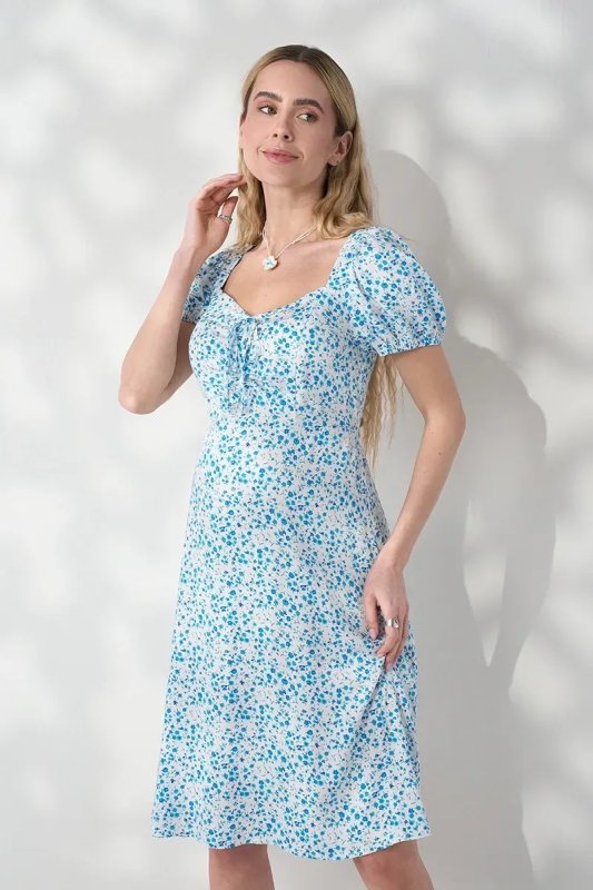 Елегантна сукня зі штапелю з призбиранням на ліфі молочного кольору з блакитними квітами для вагітних та годуючих Eileen. Вишукана сукня для вагітних і годуючих із легкої тканини, яка поєднує комфорт і жіночний стиль.