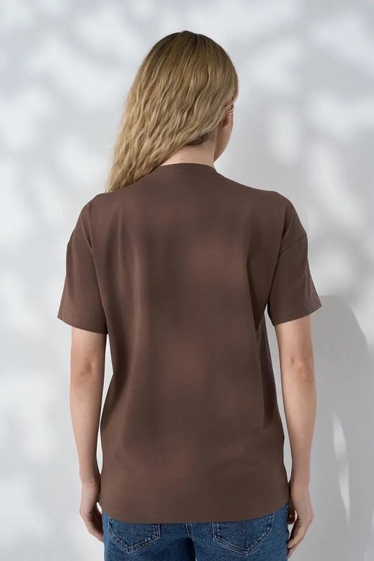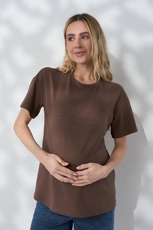 Базова футболка оверсайз, яка працює на два етапи: зручна під час вагітності завдяки вільному силуету і залишається актуальною після пологів — завдяки прихованій блискавці для годування. Глибокий шоколадний відтінок робить образ теплим і виразним.