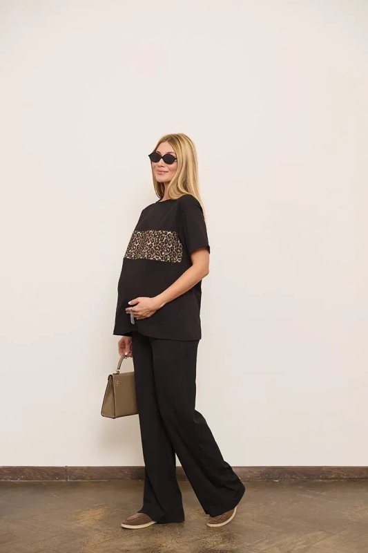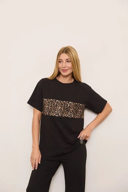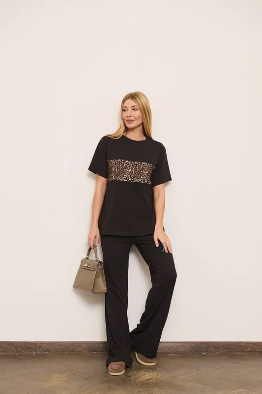 Футболка має короткі рукави та класичний круглий виріз горловини. Стильним акцентом виступає вставка з леопардовим принтом, яка додає образу виразності та сучасного характеру.