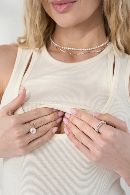 Секрет годування Глибокий виріз горловини продубльований коротким внутрішнім топом — забезпечує дискретний і зручний доступ для годування без зайвих рухів і незручних моментів. Виглядає як звичайна стильна майка, працює як одяг для годуючих мам.