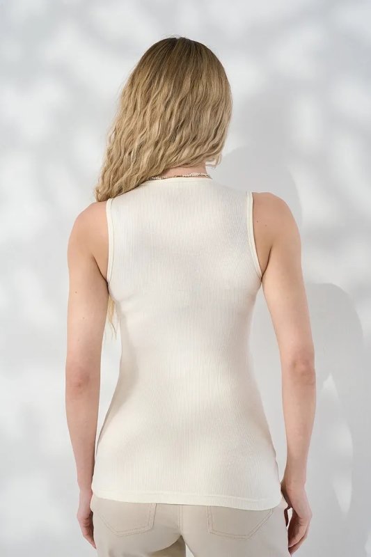 Матеріал М'який віскозний трикотаж у рубчик — ніжна, приємна до тіла тканина з розтяжністю 22–27%. Дихає, не подразнює шкіру і повертається до початкової форми після розтягування. Молочний колір — тепла нейтральна база, яка легко поєднується з джинсами, штанами та спідницями будь-якого кольору.