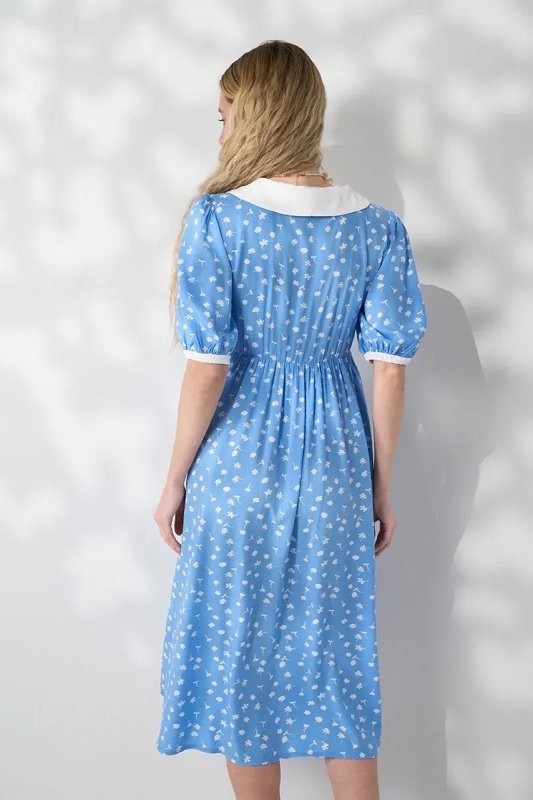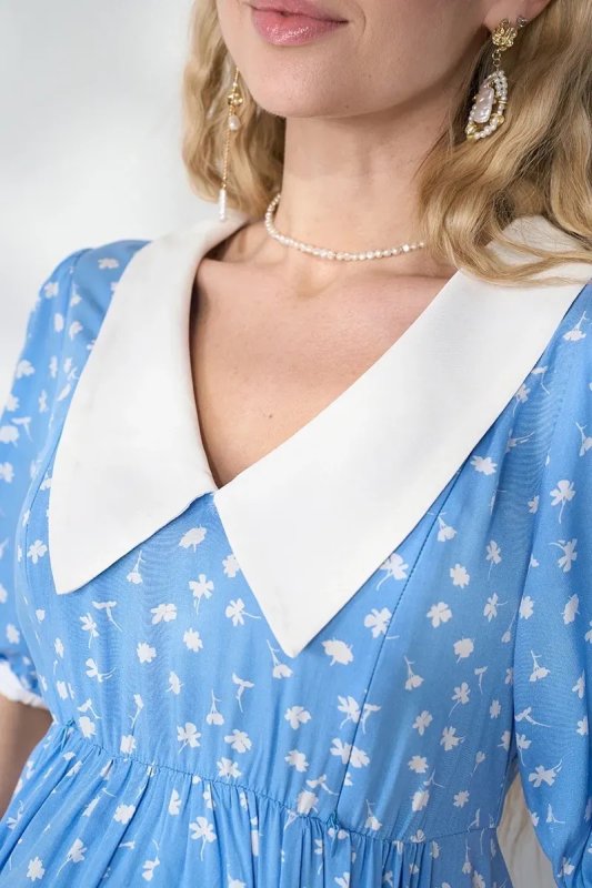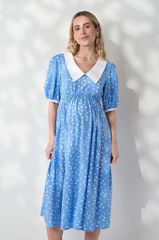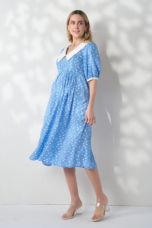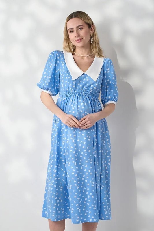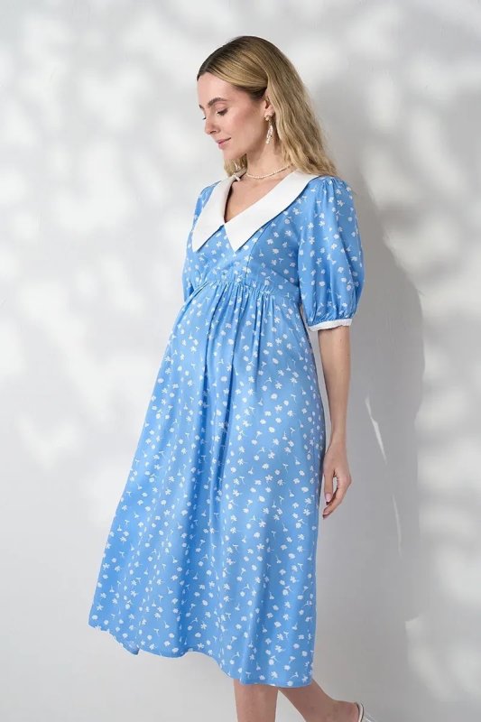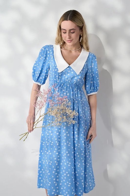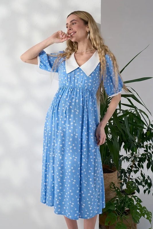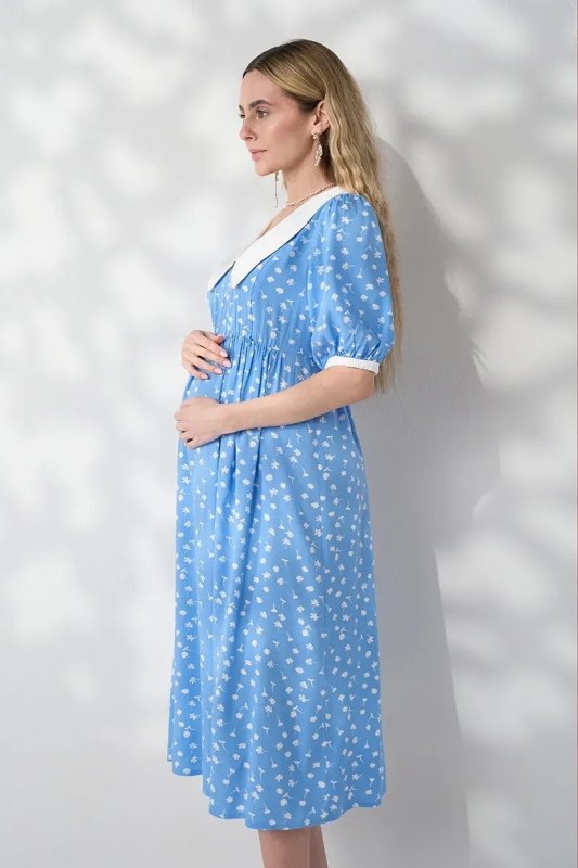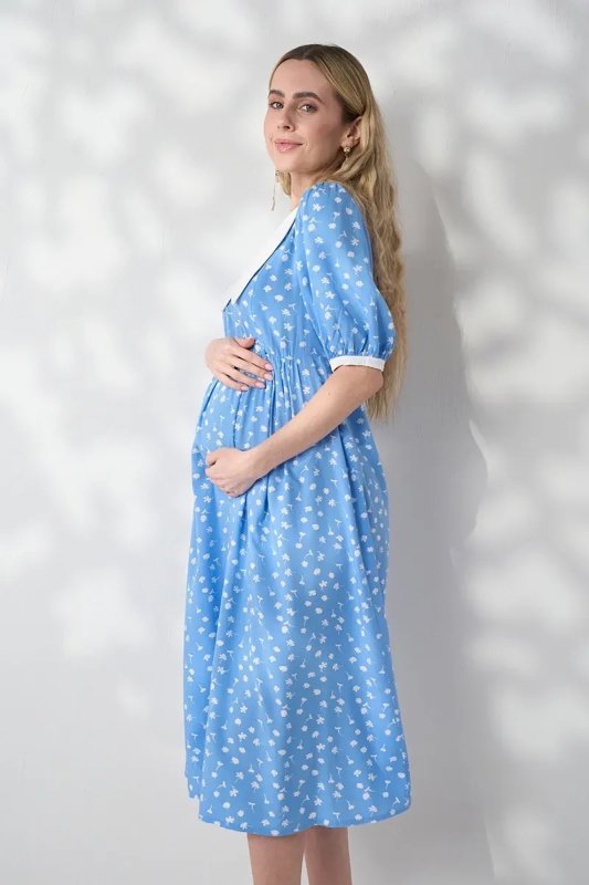 Трендова сукня з контрастним коміром, яка працює на два етапи: розкішна під час вагітності завдяки спідниці-дзвіночку зі збірками і залишається актуальною після пологів — завдяки прихованим блискавкам для годування. Блакитний штапель із молочними квітами — ніжне поєднання для особливих моментів.