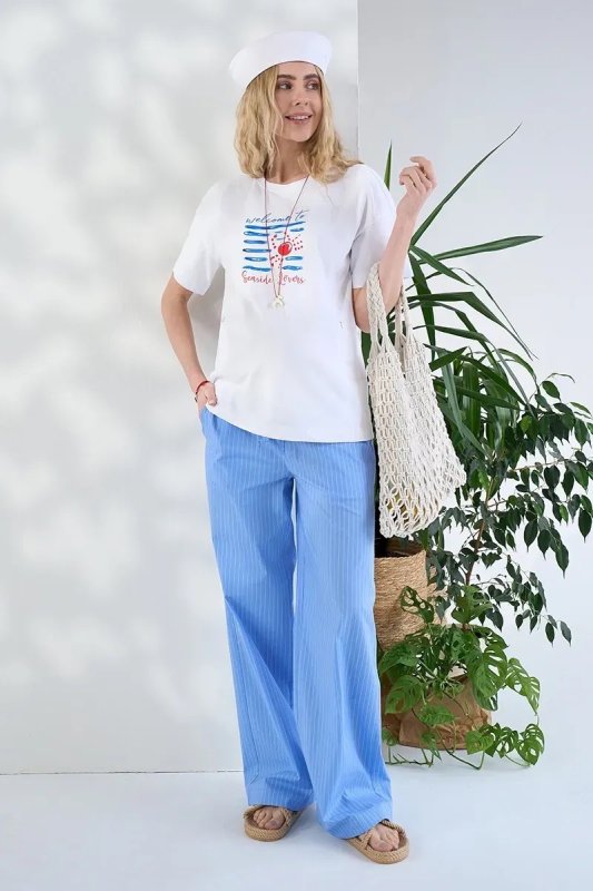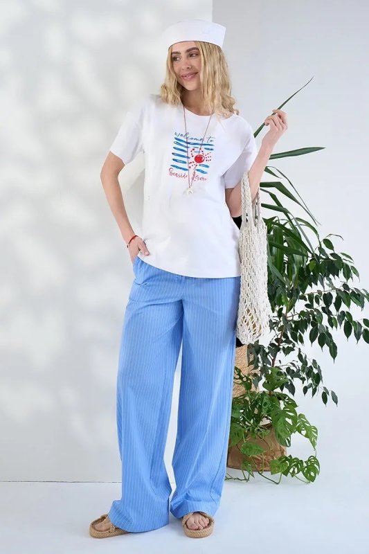 Матеріал Стрейчевий поплін — щільна, гладка тканина з невеликою часткою розтяжності (6–8%). Приємна до тіла, дихає, не подразнює шкіру і добре тримає силует. Блакитний колір у білу смужку — свіжий і універсальний принт, який легко поєднується з білими, молочними та базовими топами.