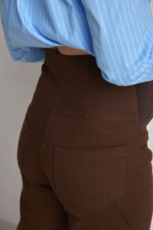 Висока еластична вставка акуратно адаптується під зростаючий животик на будь-якому терміні вагітності, забезпечуючи м’яку підтримку без тиску. Прямий крій і глибокий коричневий колір дозволяють створювати як ділові, так і повсякденні образи. Джинс-котон забезпечує відмінну терморегуляцію та довговічність виробу.