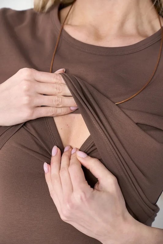 Тканина: м'який бавовняний трикотаж, склад — 95% бавовна, 5% еластан. Розтяжність 25–30% — ідеально адаптується до фігури під час вагітності та після пологів. Колір: кава.