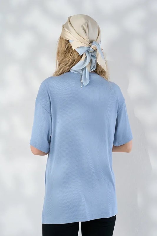 Матеріал М'який віскозний трикотаж у рубчик — ніжна, приємна до тіла тканина з розтяжністю 20–25%. Дихає, не подразнює шкіру і повертається до початкової форми після розтягування. Блакитний колір — свіжа і універсальна база, яка легко поєднується з джинсами, штанами та спідницями будь-якого кольору.