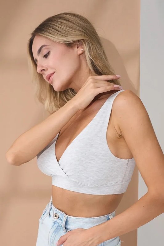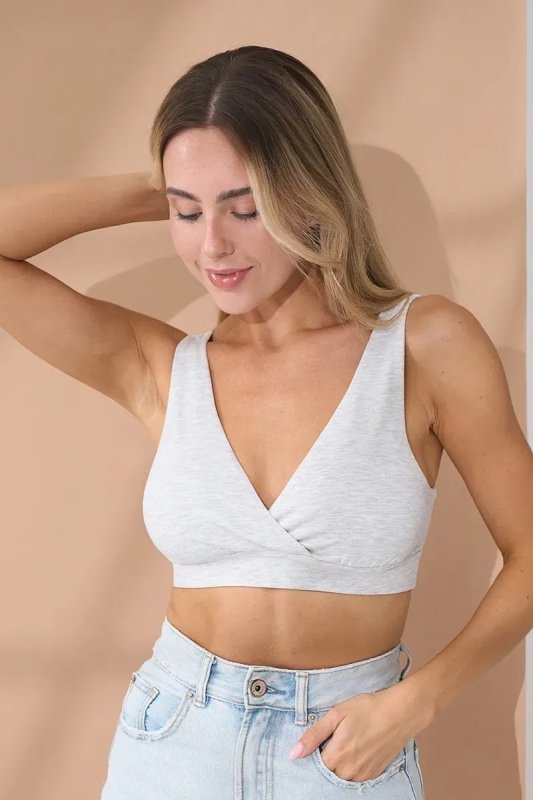 Зручний топ для вагітних та годуючих мам на запах у кольорі сірий меланж — ідеальний варіант для дому та сну.