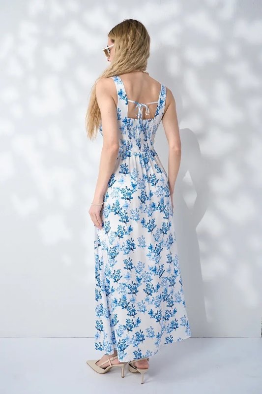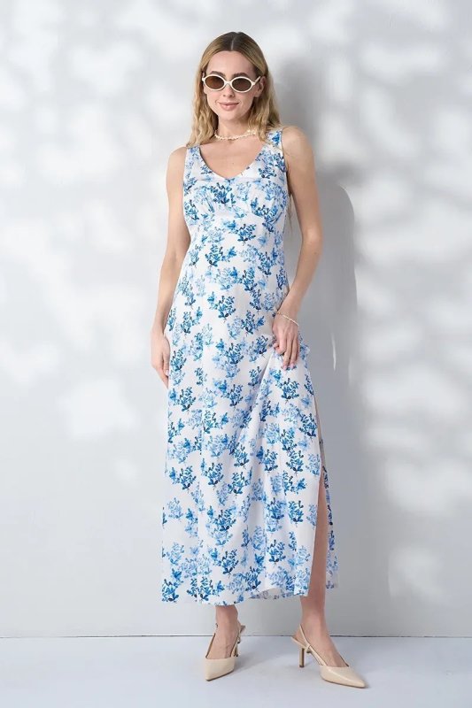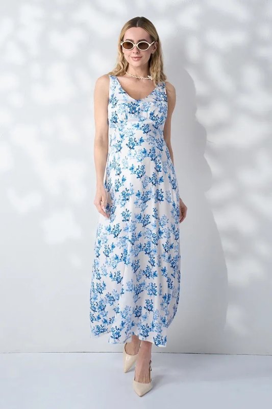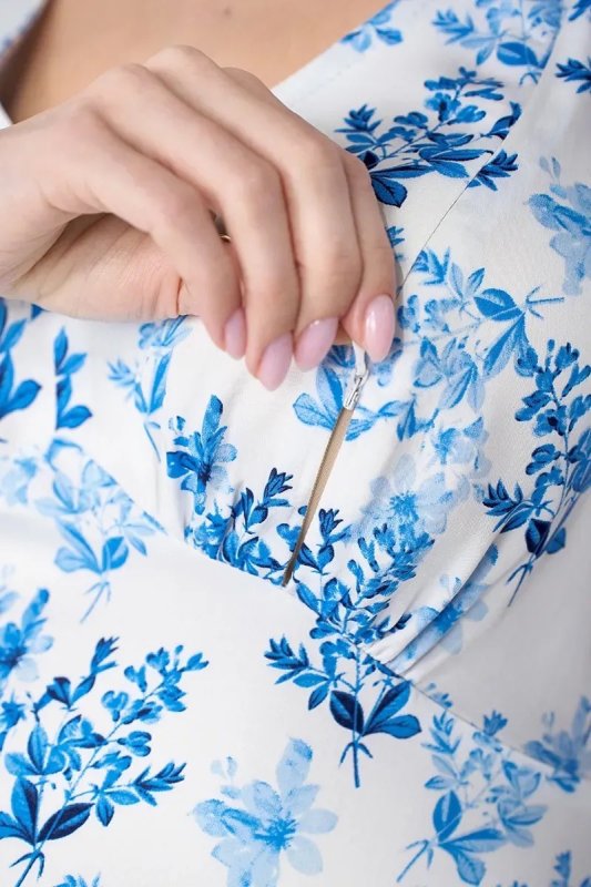 Женственный сарафан макси с расклешённой юбкой, который работает на два этапа: элегантен во время беременности и остаётся актуальным после родов — благодаря скрытым молниям для кормления. Молочный фон с синими цветами — свежее и романтичное сочетание для любого случая.